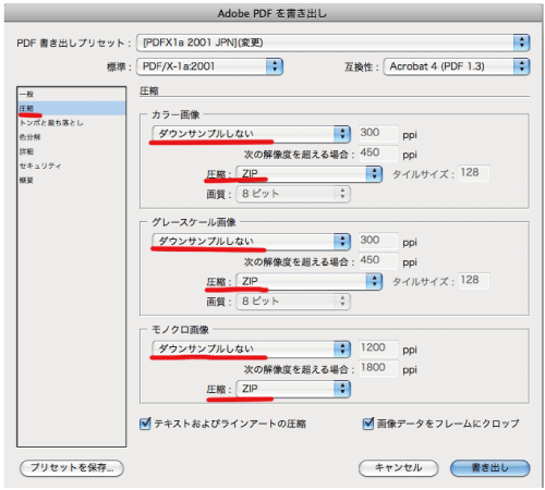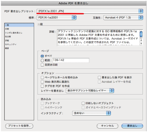 「PDF書き出しプリセット」で『PDFX1a 2001 JPN(日本)』が選択されていることを確認